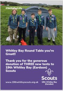 During 2024 the group gratefully received a donation from Whitley Bay Round Table to replace a number of tents for the group. If you are aware of any community funding or groups who are looking to support a local charity, please get in touch.